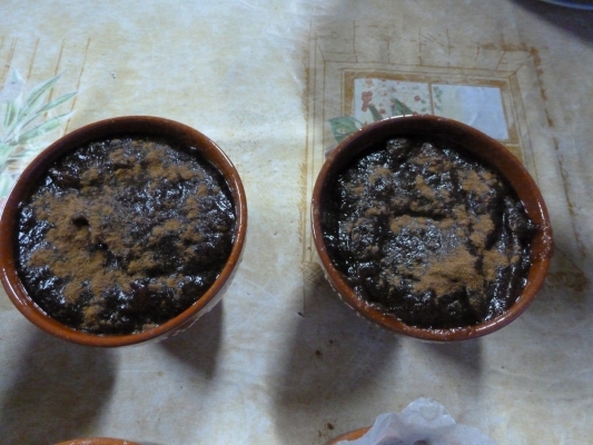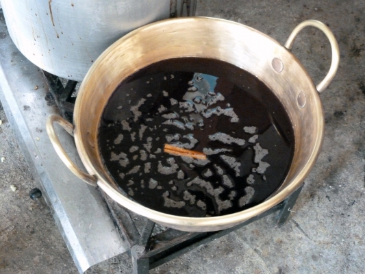 Deita-se lá dentro “o mosto” ou seja o sumo de uva acabado de tirar da tina ou da bica do lagar. Tem de ser vinho em mosto daquele dia para não dar tempo a fermentar. Enquanto o vinho vai fervendo no tacho de arame, vai-se tirando a espuma com a escumadeira. Quase sempre fica reduzido à metade do vinho que lá se deitou. Quando acaba a espuma fica “o arrobe” que se pode guardar para servir de açúcar para as papas de milho ou de qualquer outra coisa que precise de ser adoçada. No mesmo dia, ou no outro, deita-se lá uma porção de pêros amarelos cortados aos quartos. Os pêros vão-se desfazendo no vinho e nunca se pára de mexer o doce para não se pegar no fundo.